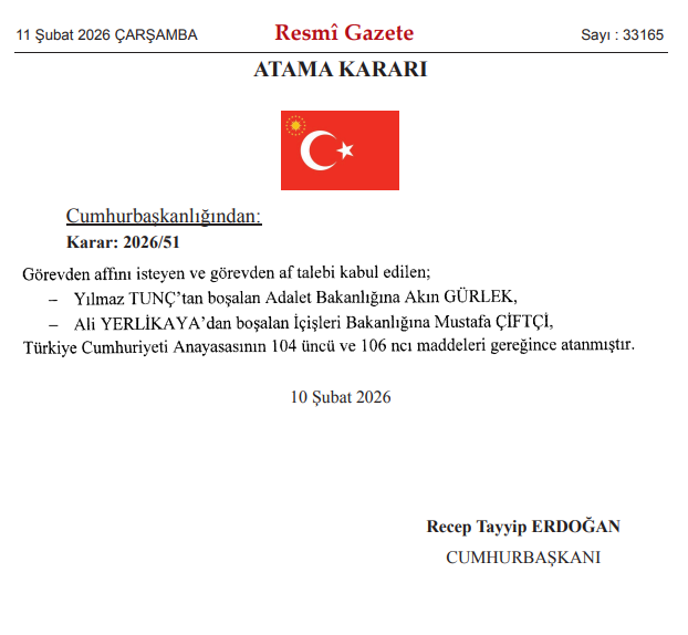 İçişleri Bakanlığına Mustafa Çiftçi, Adalet Bakanlığına Akın Gürlek atandı